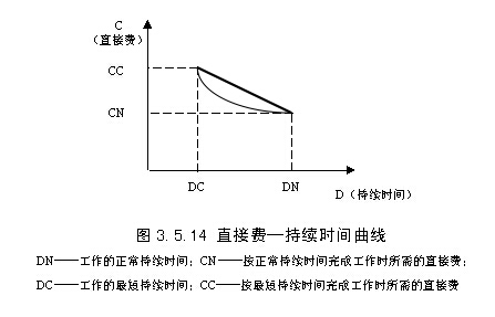 工作的直接费与持续时间之间的关系类似于工程直接费与工期之间的关系,工作的直接费随着持续时间的缩短而增加,如图3.5.14所示。