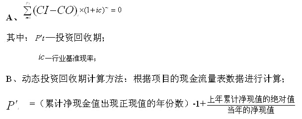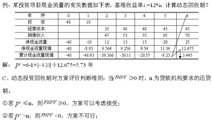 3)动态投资回收期:在考虑了时间价值的情况下,以项目每年的净收益回收全部投资所需的时间。