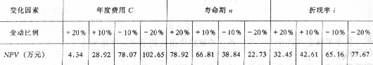 由图9.5.8和表9.5.4可知,净现值对三个主要因素的敏感性排序为:年度费用>寿命期>折现率。
