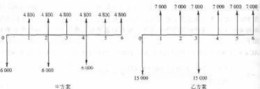 解 (1)用最小公倍数法。假设方案可以完全重复,最小公倍数法的现金流量图如下:由图可知NPV甲=-6000×[1+(P/F,10%,2)+(P/F,10%,4)]+4 800×(P/A,10%,6)