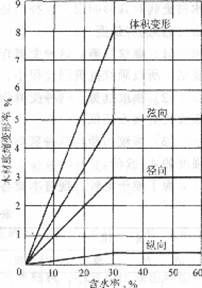 当木材从潮湿状态干燥至纤维饱和点时,自由水蒸发,其尺寸不变,继续干燥时吸附水蒸发,则发生体积收缩。反之,干燥木材吸湿时,发生体积膨胀,直至含水量达纤维饱和点为止。继续吸湿,则不再膨胀,见图10.7.1。?般地,表观密度大的,夏材含量多的,胀缩就较大。