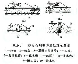 当砾石透水层不厚时,可挖出梯形槽回填黏土成为截水槽,如图8.2-2(d)所示。当透水层较厚时,可用板桩、连续的混凝土排桩和混凝土防渗墙等垂直防渗措施截断透水层,如图8.2-2(b)所示。对于防渗要求较高的砂砾坝基,可用相互搭接的大直径钻孔桩穿过透水层,形成一道连续横向防渗墙,如图8.2-2(c)所示。