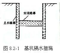 基坑隔水包括侧向隔水帷幕(墙)和封底隔水帷幕,如图8.2-1。常用的侧向隔水帷幕(墙)有地下连续墙、板桩,或采用搅拌桩、高压喷射注浆法形成搅拌桩或旋喷(定喷、摆喷)桩墙,也可采用冻结法形成隔水墙。当坑底以下不深处存在不透水土层时,应将侧向隔水帷幕(墙)进入不透水层;当不透水层埋藏较深、坑底以下土层渗透性高时,可考虑采用封底隔水帷幕。在软土地区,封底隔水帷幕还可减少挡土桩的变形;基坑深度不大时,搅拌桩、高压喷射注浆法形成搅拌桩或旋喷(定喷、摆喷)桩墙只要具备足够厚度,还可形成重力式挡土墙,兼隔水与挡土功能。