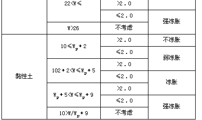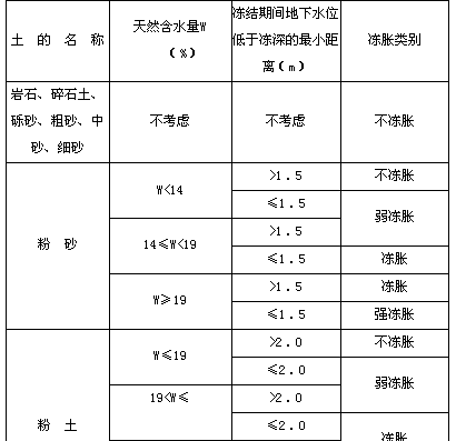 注:1、表中碎石土仅指充填物为砂土或硬塑、坚硬状态的黏性土或饱和度不大于0.5的粉土,如充填物为其他状态的黏性土或粉土时,其冻结性应按黏性土或粉土确定。