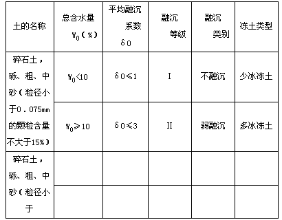 (1)按融沉性分级和评价:多年冻土根据土的类别、总含水量和平均融沉系数δ0分类(表24.4-2):