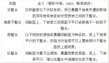 地层记录中的重要间断称为不整合,可分4种类型,其主要含义见表14。