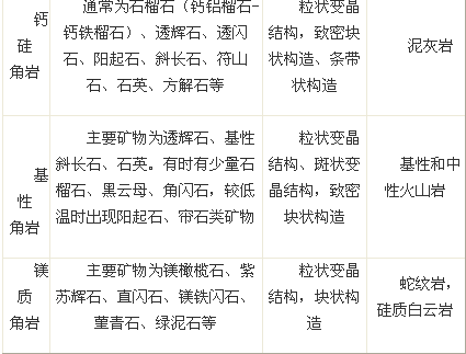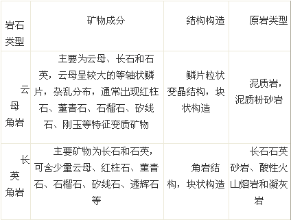 按主要矿物成分及结构特征,常见角岩类的岩石类型划分见表4-2。