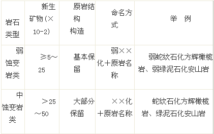 复原岩时,命名按:主要蚀变矿物或蚀变矿物组合+蚀变岩基本名称。例如:绿帘青盘岩,刚玉红柱次生石英岩。