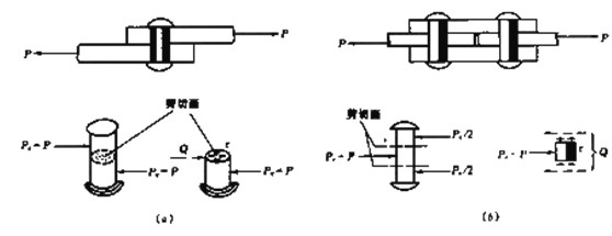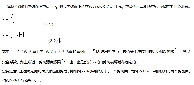 当作为连接件的铆钉、螺栓、销钉、键等承受一对大小相等、方向相反、作用线互相平行且相距很近的力作用时,当外力过大;其主要破坏形式之一是沿剪切面发生剪切破坏,如图2-1所示的铆钉连接中的铆钉。因此必须考虑其剪切强度问题。