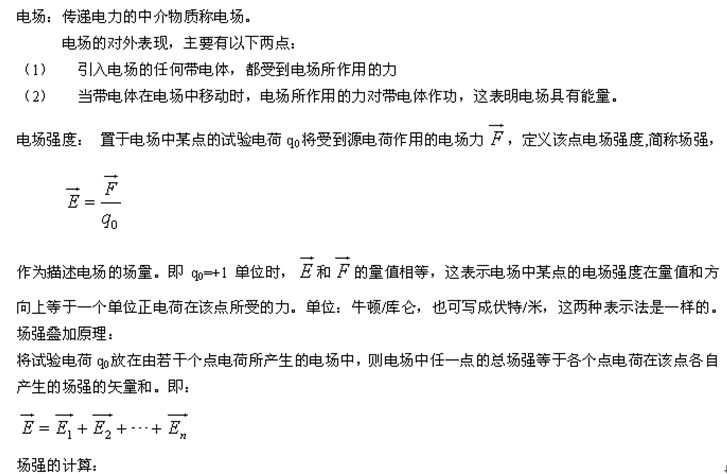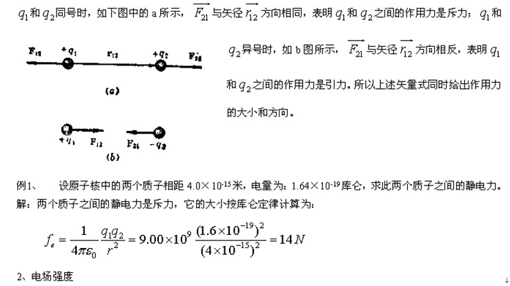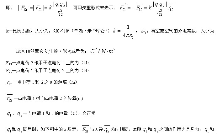 库仑定律: 在真空中两个静止点电荷间的相互作用力,方向沿两个点电荷的连线,同种电荷相斥,异种电荷相吸;大小正比于两点电荷电量大小的乘积,反比于两点电荷间距离的平方。