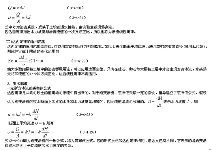 达西分析了大量实验资料,得到圆筒内的渗流量Q与圆筒横断面积A和水力坡度 成正比,并和土壤的透水性能有关。达西建立的基本关系为:
