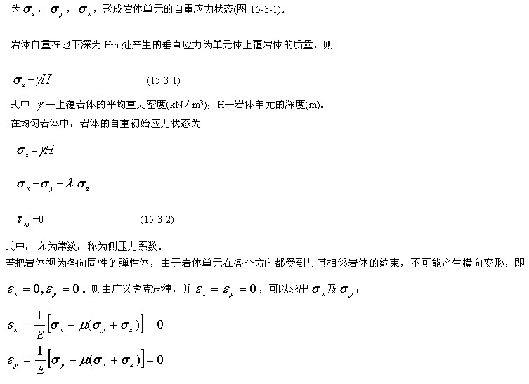 岩体自重应力场的计算,大都是建立在假定岩体为均匀连续介质基础之上的。因此,可以应用连续介质力学的原理来计算岩体的自重应力场。设岩体为半无限体,地面为水平面,距地表深度为H处,有一单元体,其上作用的应力