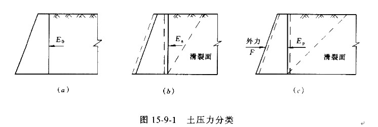 如果挡土结构在土压力的作用下,其本身不发生变形和任何位移(移动或转动),土体处于弹性平衡状态,则这时作用在挡土结构上的土压力称为静止土压力,如图15-9-1(a)所示。