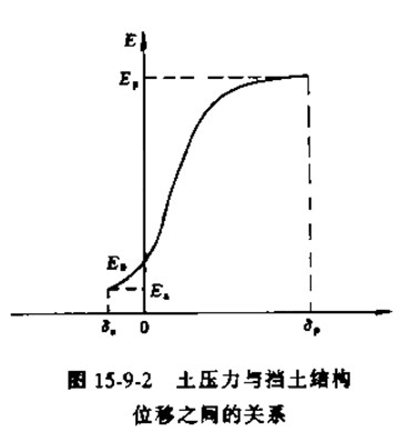 在实际工程中,大部分情况下的土压力值均介于上述三种极限状态下的土压力值之间。土压力的大小及分布与作用在挡土结构上的土体性质、挡土结构本身的材料及挡土结构的位移情况等有关,其中挡土结构的位移情况是影响土压力性质的关键因素。图15-9-2表示了土压力与挡土结构位移之间的关系,由此可见产生被动土压力所需要的位移量大大超过产生主动土压力所需要的位移量。