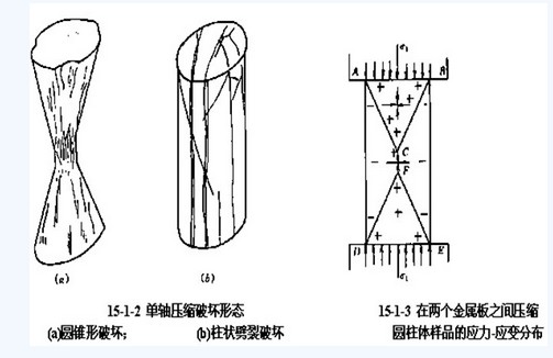 2)柱状劈裂破坏(见图15-1-2b):在发现圆锥形破坏的真正原因之后有人在上下压板与试件端面之间,涂上了一层薄薄的凡士林以减小接触面之间的摩擦力,最终岩石试件由于产生平行于所施加的轴向力的裂缝而破坏。对于不同的岩石所含的矿物成份和所含裂隙的不同,局部还会出现些较小的斜向裂缝。应该说柱状劈裂破坏是真正反映岩石单轴压缩破坏的形态。