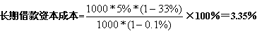某公司欲从银行借款1000万元,手续费率0.1%,年利率5%,期限3年,每年结息一次,到期还本,公司所得税税率为33%。则该笔长期借款筹资成本为: