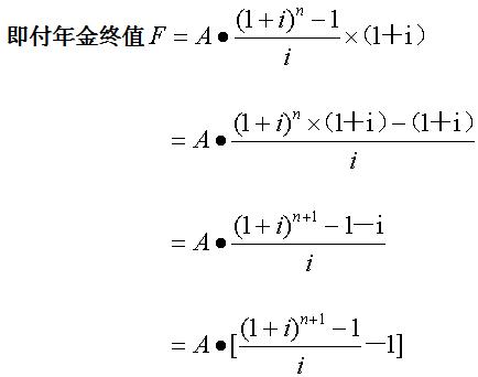 F=A?[(F/A,i,n+1)-1],其中[(F/A,i,n+1)-1]为即付年金终值系数