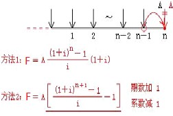 方法一:若向前延长一期,起点为-1,则可看出由(-1~n-1)刚好是n个期间,套用普通年金终值的计算公式,得出来的是在第n-1期期末的数值A(F/A,i,n),为了得出n年末的终值,F=A(F/A,i,n)(1+i)