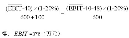 根据财务人员测算,追加筹资后销售额可望达到1200万元,变动成本率60%,固定成本为200万元,所得税率20%,不考虑筹资费用因素。根据上述数据,代入无差别点公式: