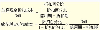 如果放弃现金折扣(即不在折扣期内付款)则要承担的借款成本。其实,放弃现金折扣的信用成本计算就是一个计算"借款"年利率的问题,(信用期-折扣期)表示的是"实际借款天数"。