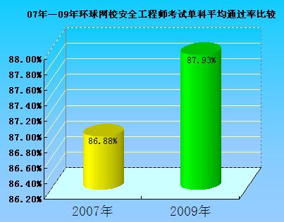 根据相关机构公布的数据,2007年至2009年注册安全工程师考试单科平均通过率分别为86.88%、87.93%.