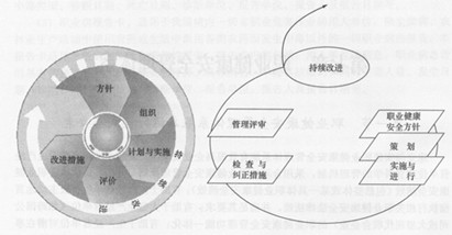 职业健康安全管理体系,是指为建立职业健康安全方针和目标以及实现这些目标所制定的一系列相互联系或相互作用的要素。它是职业健康安全管理活动的一种方式,包括影响职业健康安全绩效的重点活动与职责以及绩效测量的方法。职业健康安全管理体系的运行模式可以追溯到一系列的系统思想,最主要的是Edward Deming的PDCA(即策划、实施、评价、改进)概念。在此概念的基础上并结合职业健康安全管理活动的特点,不同的职业健康安全管理体系标准提出了基本相似的职业健康安全管理体系运行模式,其核心都是为生产经营单位建立一个动态循环的管理过程,以持续改进的思想指导生产经营单位系统地实现其既定的目标。如ILO一OSHl2001的运行模式为方针、组织、计划与实施、评价、改进措施(图9—1);OHSASl8001.的运行模式为职业健康安全方针、策划、实施与运行、检查与纠正措施、管理评审(图9—2)。