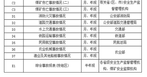 (4) 消防火灾事故情况表D1,由公安部消防局报送;道路交通事故情况表D2,由公安部道路交通管理局报送;水上交通事故情况表D3,由交通部海事局报送;铁路运输事故情况表D4,由铁道部安监司报送;民航飞行事故情况表D5,由民航总局安全办公室报送;农业机械事故情况表D6,由农业部农机监理总站报送;渔业及其他船舶事故表D7,由农业部渔政指挥中心报送。