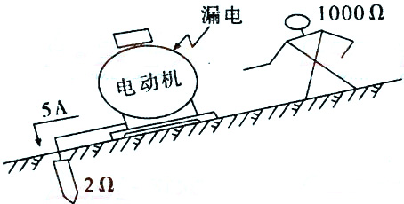 11.对于T频电流,人的感知电流约为0.5~1mA、摆脱电流约为5~10mA、室颤电流约为50mA。某事故现场如下图所示,电动机接地装置的接地电阻为2Q;该电动机漏电,流过其接地装置电流为5A;地面十分潮湿。如果电阻l000Q的人站在地面接触该电动机,可能发生最严重的情况是( )。 $lesson$