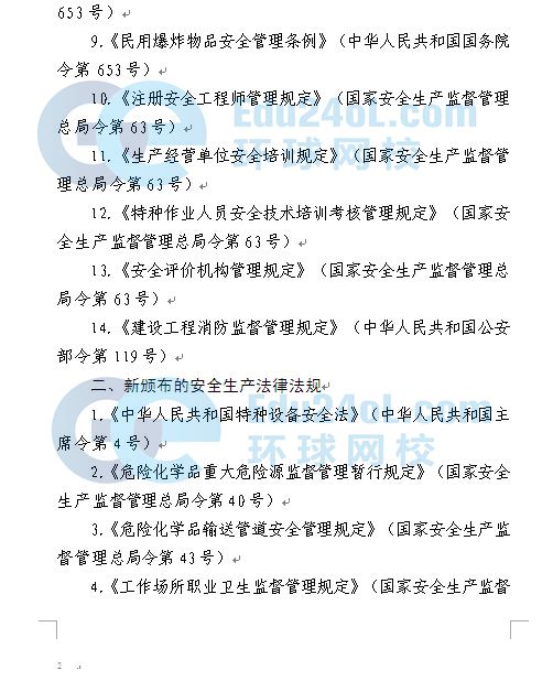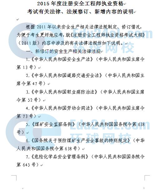 【摘要】为了帮助考生顺利报考安全工程师考试,环球网校编辑整理了"安全工程师《法律法规》修订、新增内容的说明",希望对大家有所帮助!祝考试顺利!