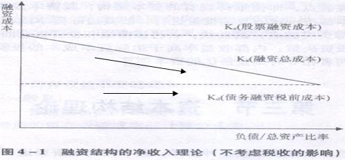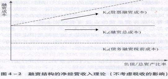 该理论假定,不管企业财务杠杆多大,债务融资成本和企业融资总成本是不变的。但是,当企业增加债务融资时,股票融资的成本就会上升。原因在于股票融资的增加会由于额外负债的增加,使企业风险增大,促使股东要求更高的回报。尽管如此,企业可以通过增加成本较低的负债融资而抵消成本较高的股权融资的影响,以减少融资的成本和风险。因此,负债比例的高低都不会影响融资总成本,也就是说,融资总成本不会随融资结构的变化而变化(如图4―2)。