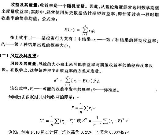 证券A的收益率为rA,证券B的收益率为rB,证券组合的期望收益率E(rP)和收益率的方差:教材第317页,公式7.1和7.2