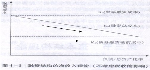 根据以上假定,当企业增加债券融资比重时,融资总成本会下降(见图4-1)。