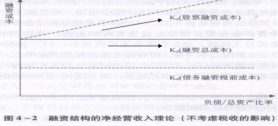 该理论假定,不管企业财务杠杆多大,债务融资成本和企业融资总成本是不变的。但是,当企业增加债务融资时,股票融资的成本就会上升。原因在于股票融资的增加会由于额外负债的增加,使企业风险增大,促使股东要求更高的回报。尽管如此,企业可以通过增加成本较低的负债融资而抵消成本较高的股权融资的影响,以减少融资的成本和风险。因此,负债比例的高低都不会影响融资总成本,也就是说,融资总成本不会随融资结构的变化而变化(如图4―2)。