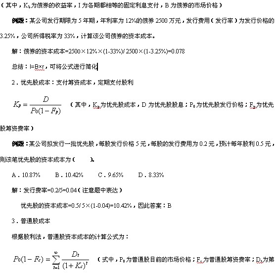 1.公司债券成本:从融资者的角度来看,债券的成本是公司为获得资金所支付的各项费用。从投资者的角度来看,债券的成本可以看作是使投资者预期未来现金流量(本金和本金收入)的现值与目前债券的市场价格相等的一个折现率:
