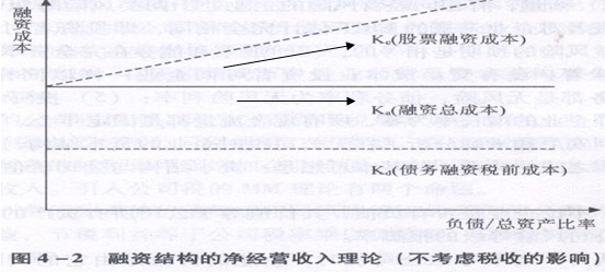 该理论假定,不管企业财务杠杆多大,债务融资成本和企业融资总成本是不变的。但是,当企业增加债务融资时,股票融资的成本就会上升。原因在于股票融资的增加会由于额外负债的增加,使企业风险增大,促使股东要求更高的回报。尽管如此,企业可以通过增加成本较低的负债融资而抵消成本较高的股权融资的影响,以减少融资的成本和风险。因此,负债比例的高低都不会影响融资总成本,也就是说,融资总成本不会随融资结构的变化而变化(如图4―2)。