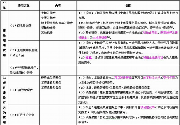 按其内容大体可分为三类:第一类是建设用地费用;第二类是与项目建设有关的费用;第三类是与项目运营有关的费用。具体参见表6-8。
