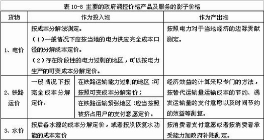 (二)几种主要的政府调控价格产品及服务的影子价格(如表10-8所示)