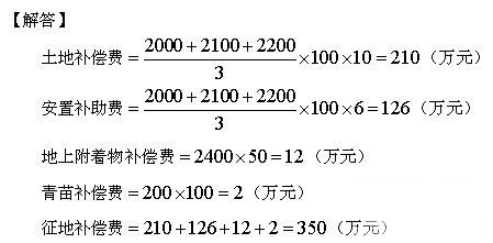【例题9】某建设项目,需要征用耕地100亩,该耕地被征用前三年平均每亩年产值分别为2000元、2100元和2200元,土地补偿费标准为前三年平均年产值的10倍;被征用单位人均占有耕地1亩,每个需要安置的农业人口的安置补助费标准为该耕地被征用前三年平均年产值的6倍;地上附着物共有树木2400棵,补偿标准为50元/棵,青苗补偿标准为200元/亩,则该征地补偿费为( )。