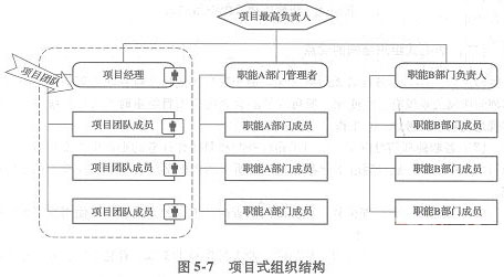 项目式组织结构形式就是将项目的组织独立于公司职能部门之外,由项目组织自己独立负责项目的主要工作的一种组织管理模式。项目的具体工作主要由项目团队负责。项目的行政事务、财务、人事等在公司规定的权限内进行管理。如图5-7所示。