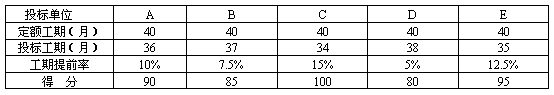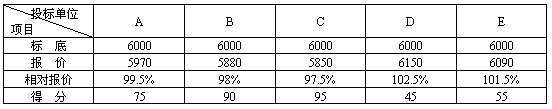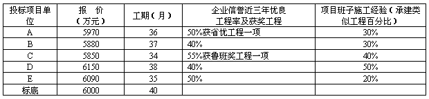 6.企业信誉评分原则是:企业近三年工程优良率为准,100%为满分,如有国家级获奖工程,每项加20分,如有省市奖优良工程每项加10分;项目班子施工经验评分原则是以近三年来承建类似工程与承建总工程百分比计算100%为100分。下面是五家投标单位投标报表情况: