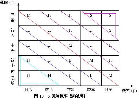 风险的大小可以用风险评价矩阵,也称概率-影响矩阵来表示。它以风险因素发生的概率为横坐标,以风险因素发生后对项目的影响大小为纵坐标,如图13-5。