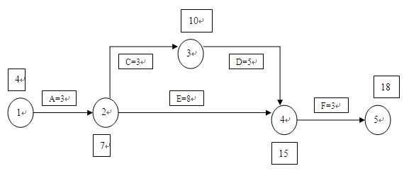 (1)第一次优化。可压缩的工作有C.D.F.选择费用率最低的工作C进行压缩,将其压缩1个月,增加费用4万元,计算工期为18个月。关键线路:①→②→③→④→⑤和①→②→④→⑤。见下图。