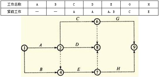 9、根据下表给定的逻辑关系绘制某分部工程双代号网络计划如下图所示,其作图错误的是( )。
