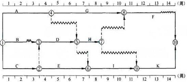 答案解析:B工作的自由时差就是B工作箭线上波形线的长度为1周。B工作的总时差=B工作的自由时差+D工作的总时差=1+1=2周。参见教材P228。