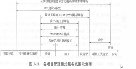 根据工程项目的合同关系与组织管理关系的不同,考虑工程项目融资、设计、采购、施工、运营的一体化程度,工程项目的管理模式的服务范围如图1―11所示。$lesson$