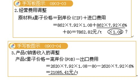 (1)原材料A(外贸货物)的影子价格=到岸价格+进口费用(贸易费用+国内运费)=862×7.92×1.08+862×7.92×6%+80=7862.82元/t。