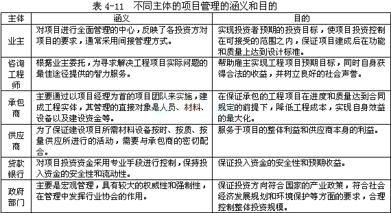 项目管理的主体是项目管理者,主要涉及到业主、咨询工程师、承包商、供应商、贷款银行和政府部门等。