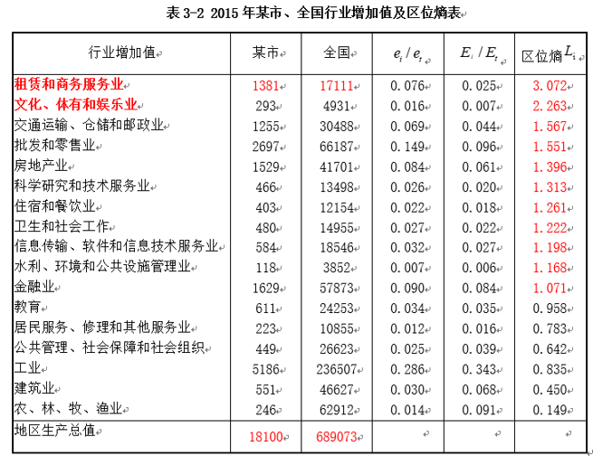 知识点:第二章规划咨询的主要理论与方法某市为我国珠三角地区的城市,近年来第三产业发展迅速,第三产业占地区生产总值比重超过70%。为进一步促进产业发展,该市现委托某咨询企业为其编制产业规划。咨询企业从该市的统计年鉴中获取了以下行业增加值数据(表3-1),想通过这些数据来分析哪些行业是具有全国比较优势的产业。请问该咨询公司可以采用何种方法来分析该市的优势产业,并分析该市哪些产业具有比较优势。