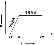 干燥过程分成两阶段,恒速阶段(平行于横轴直线)和降速阶段(斜向下线)。在恒速阶段,干燥速率与物料湿含量无关。而在降速阶段,干燥速率近似地与物料湿含量成正比。物料湿含量大于C0时,干燥过程属于恒速阶段,当物料湿含量小于C0时,干燥过程属于降速阶段。