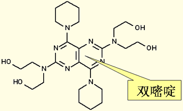 结构特点:分子结构有一定对称性。以嘧啶并嘧啶为母体,在嘧啶环2位连有二羟乙氨基,在4位连有1-哌啶基。